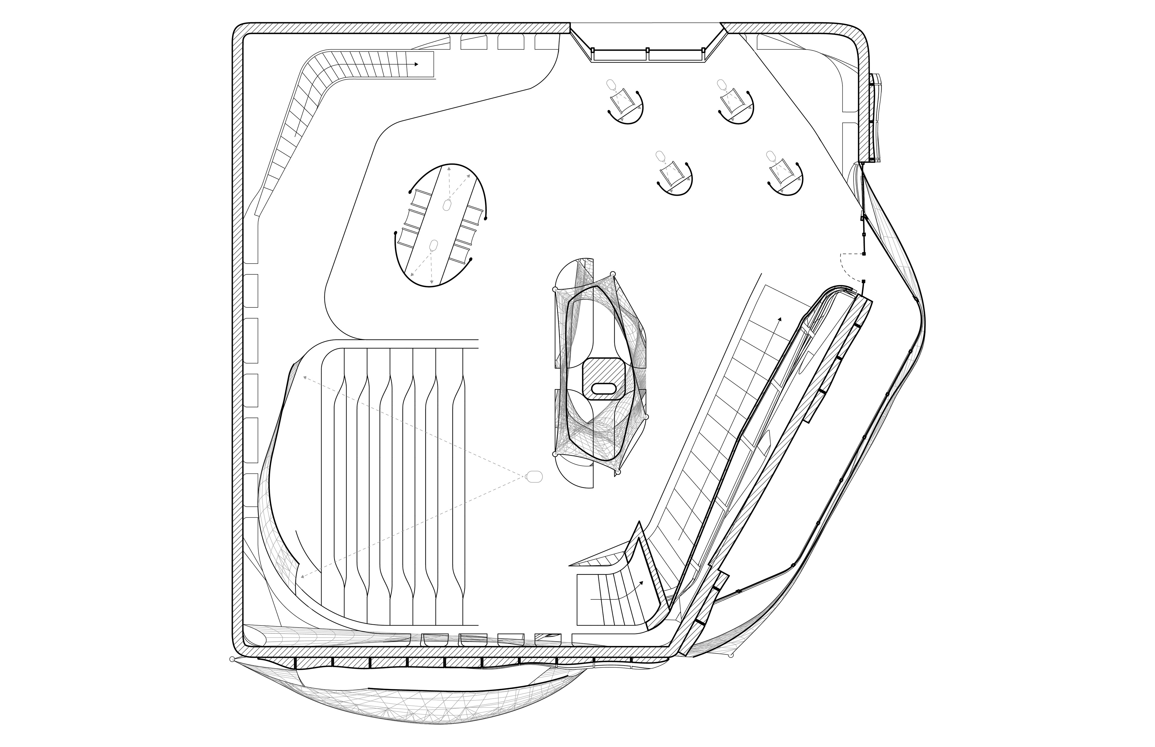 The Cinematic Arts library serves as a public cultural institution for Manhattan, borrowing and lending to galleries, museums, filmmakers, and photographers in the Chinatown area. The building serves as an archive of both physical and digital media and makes the collection open to the public in an innovative and immersive way. The design revolves around the idea of projection inherent in film and photography. The library is composed of autonomous floor and wall slabs that begin to flow and join together into one interwoven structure, much like a film strip merging into fluid motion. A secondary skin of stretched fabric is looped through the structure forming surfaces for projection, study areas, and group work stations. From the park adjacent to the site, the public can view film and photography projections across the entire facade of the building, creating a new cultural gathering point for the area.