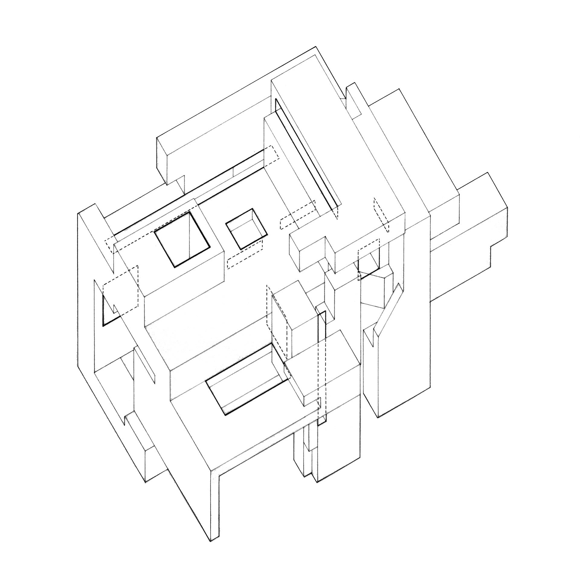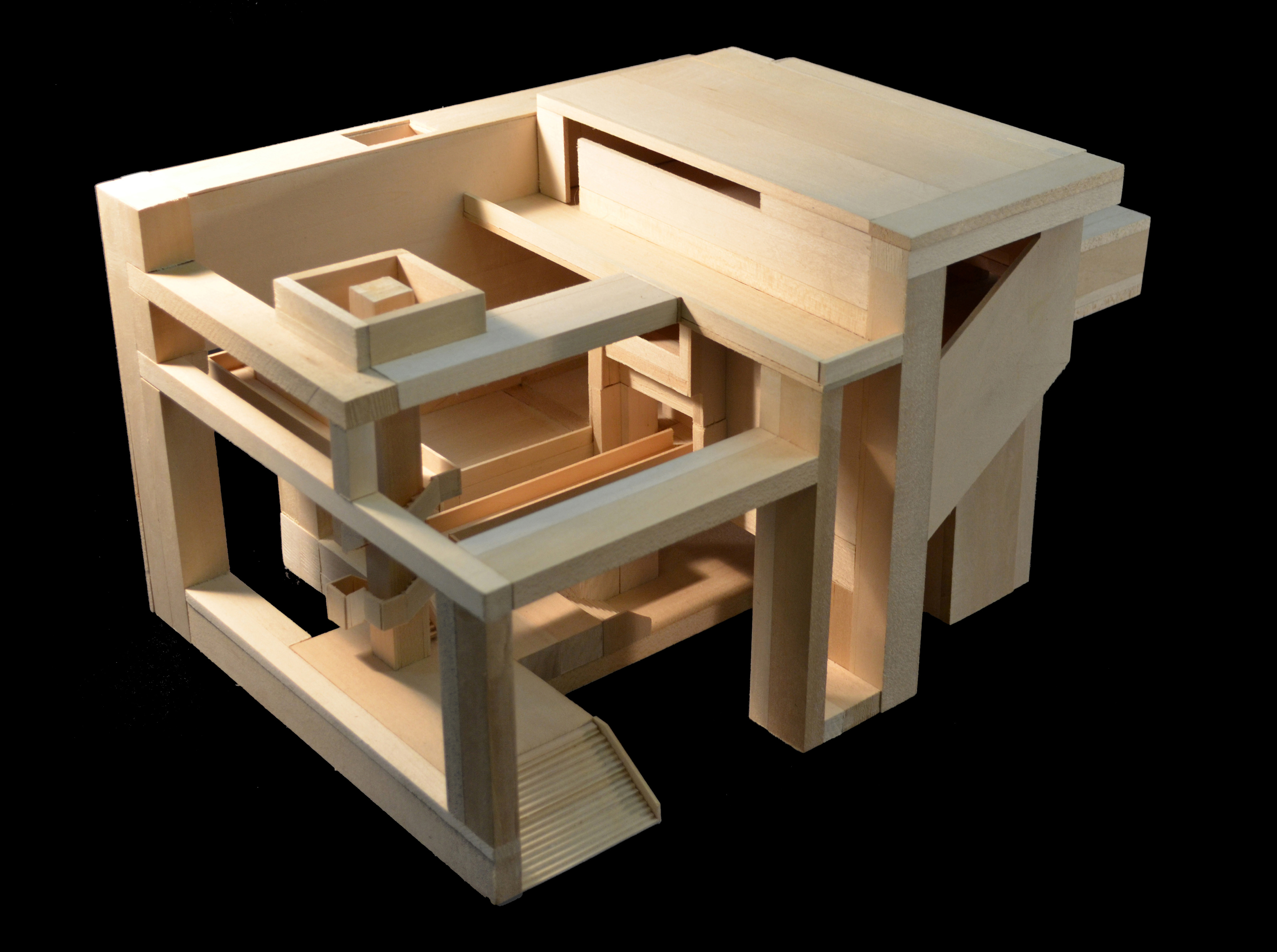 The Joint Spaces project is a beginning exploration of form, concept, and scale. Starting with a series of 3x3” wooden cubes based on Japanese joinery techniques, the project developed into a complex 9x9” puzzle block that was both expandable and reconfigurable. As the scale and complexity of the cubes increased, action verbs were introduced (dissecting, piercing, inverting, etc.) that directed the spatial goals of the wooden constructions. Lastly, the final “architectural” model is based on the spatial moments found within the 9x9” cube. These moments take the form of a large mass elevated above the open-air entry (inverting void) and a feature column and staircase that stretches uninterrupted through the height of the structure (piercing line).