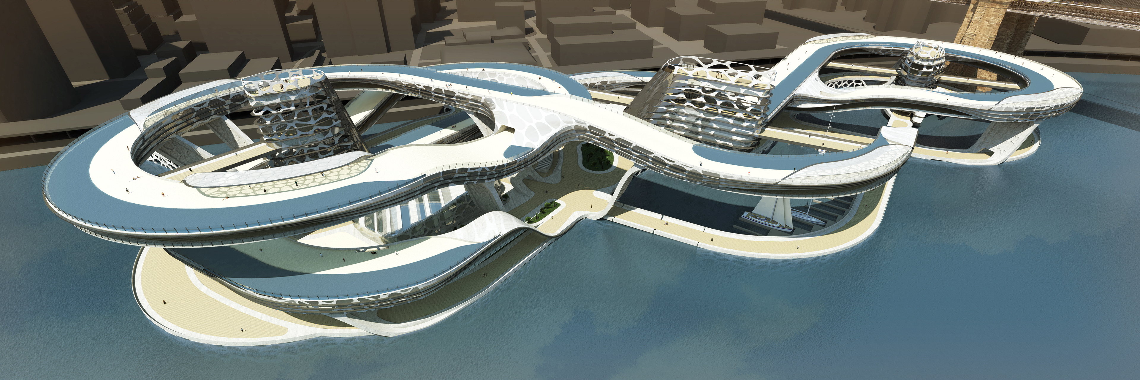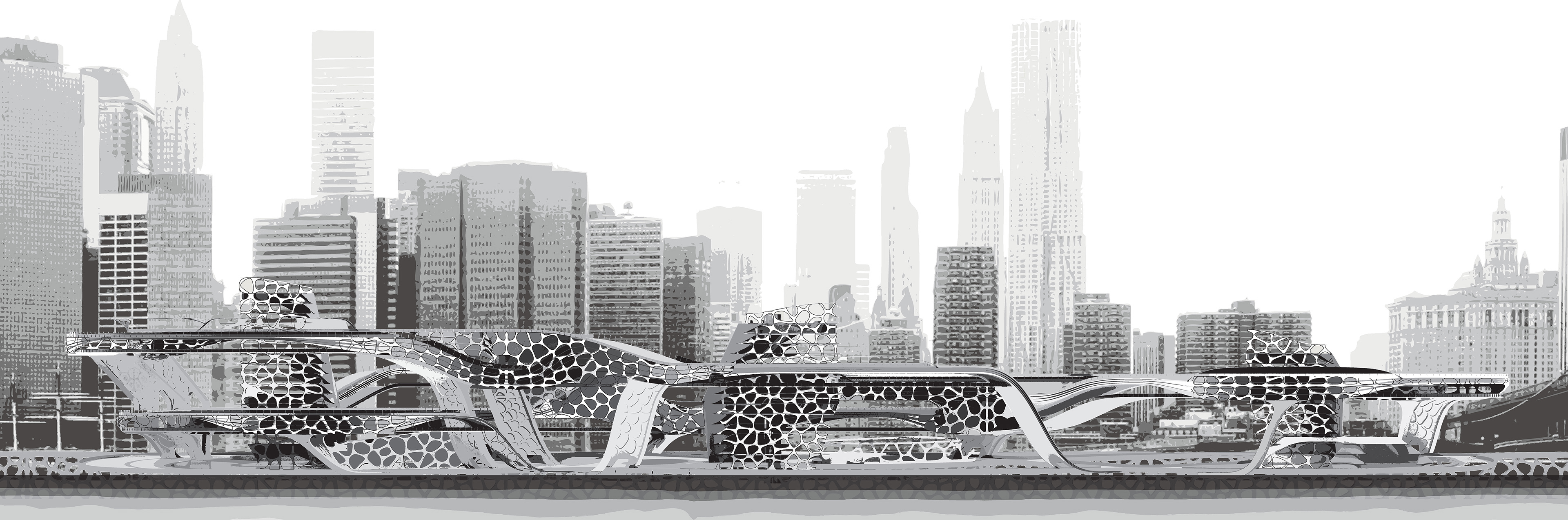 Sited along Manhattan’s East River, the program and aesthetic of SkyShore is heavily influenced by its riverside environment. Every day, many tons of sand and silt are removed from the bed of the East River to make way for ever larger commercial freight ships. SkyShore makes use of this excess material in a public landscape where dredged sand is cleaned and reused for recreational purposes. The limitations of the site led to many explorations of looping, folding, and stacking to condense miles of beach front into a confined site. Coney Island became a historical stimulus, raising questions about the limits of what is considered a beach, the role of public recreation in an urban center, and how a new beach typology could serve all of New York.